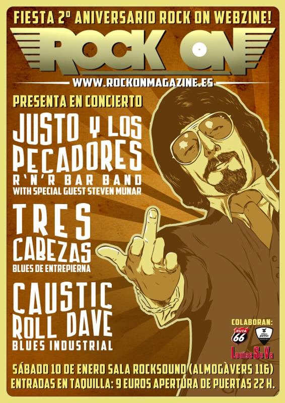 Tenemos el placer de participar con el segundo aniversario de Rock On Magazine aportando la actuación de Justo Y Los Pecadores y también de Caustic Roll Dave, artista con el que tenemos el placer de colaborar. Además actuará la interesantísima banda de blues & rock seminal Tres Cabezas.