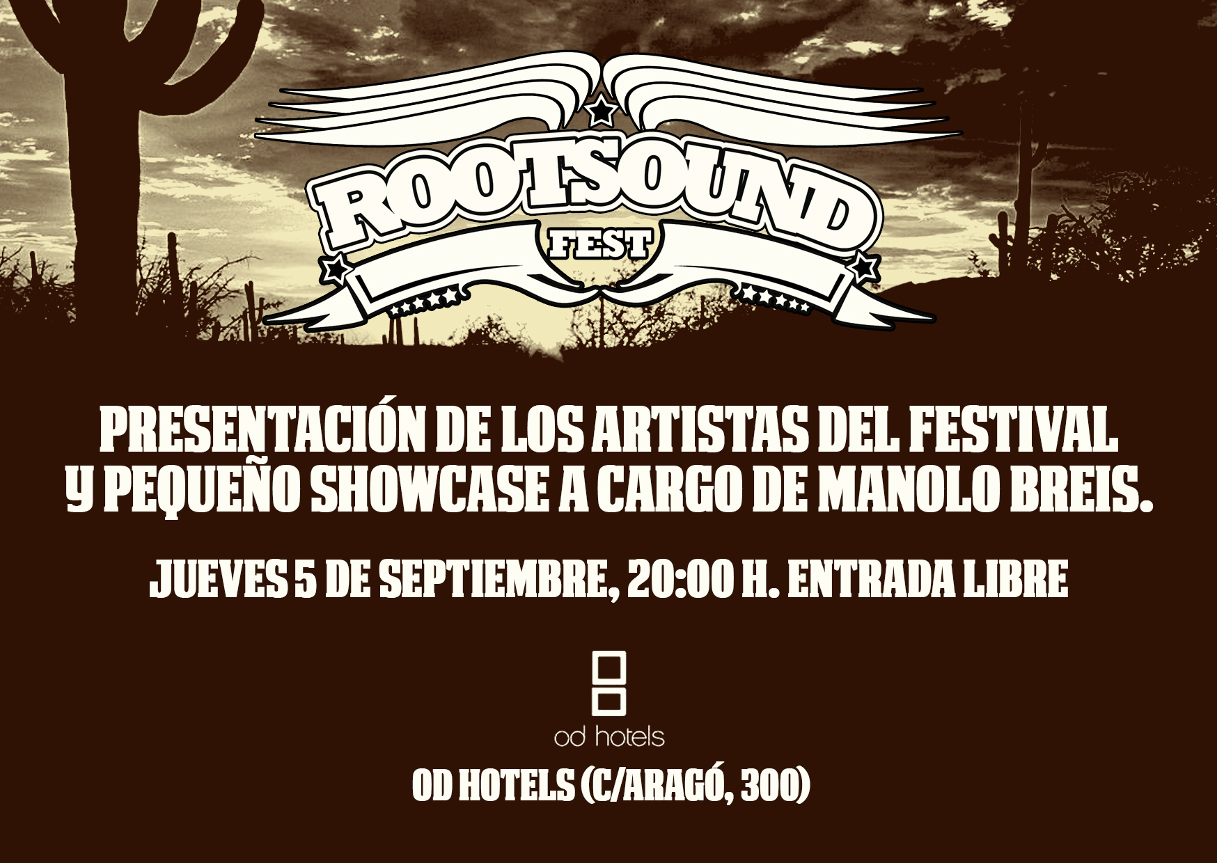 El próximo 5 de septiembre a las 20:00 h. presentamos el Rootsound Fest en el OD Hotel (Carrer Aragó núm 300, Barcelona)